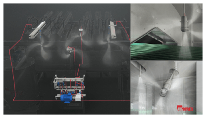Sistema di lavaggio interno della cabina tramite una centralina idraulica che attiva teste rotanti ad alta pressione e ugelli a bassa pressione.